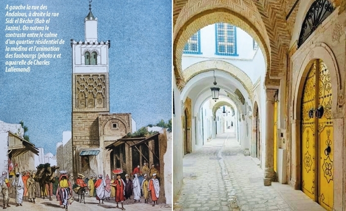 Si, dans ses grandes lignes, le schéma ainsi présenté demeura grosso modo valable jusqu’au milieu du XIXe siècle, il n’allait cesser, depuis, de subir des modifications profondes qui allaient en affecter durablement les équilibres historiques. Ces modifications eurent d’autant plus d’effets que les atteintes au monde urbain traditionnel coïncidèrent, à partir du protectorat en 1881, avec la fondation et l’essor de la ville européenne. La comparaison - trompeuse mais d’une redoutable efficacité - entre les deux conceptions urbaines et architecturales ne manqua pas de jouer contre la médina. Aux premières années du XXe siècle, on relève déjà de rares (mais non sans lendemain) abandons de la ville historique pour des résidences des environs de Tunis, naguère réservées à la villégiature. Ce phénomène de désaffection à l’égard du bâti ancestral ne touchait alors que quelques personnalités de la haute société mais il annonçait subrepticement un mouvement qui irait en s’amplifiant durant tout le XXe siècle.