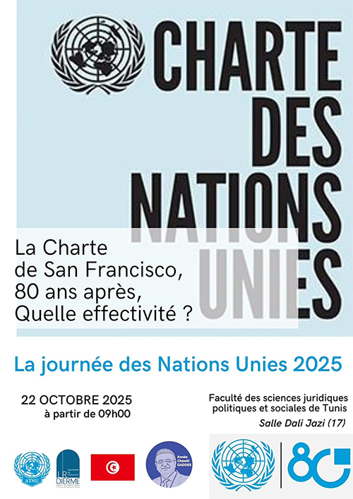 A Tunis, la Charte de San Francisco bénéficie d’un débat approfondi, dans le cadre des manifestations accompagnant le 80 anniversaire de la fondation des Nations Unies. Le colloque qu’organise le mercredi 22 octobre 2025 le Laboratoire de recherche en droit international et relations Maghreb-Europe (LRDIRME), dirigé par la professeure Salwa Hamrouni et l'Association Tunisienne des Nations Unies (ATNU) que préside l’ambassadeur Moncef Baati, entend dresser un bilan de l'application et des apports de la Charte, tout particulièrement au regard de l'évolution du droit international et de la structure de l'ordre juridique international. Un colloque où le souvenir du Pr Chawki Gaddes, disparu cet été, est fort présent.