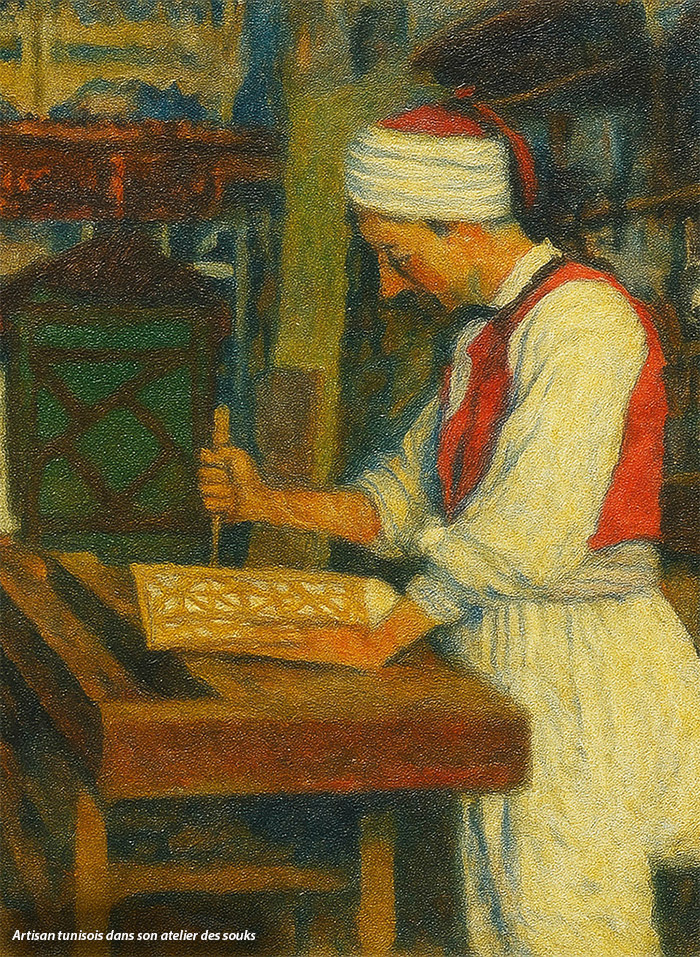 Aussi curieux que cela puisse paraître si l’on reste prisonnier de l’image erronée, apparue au XXe siècle, de bourgeois rentiers, les Tunisois de la médina ont d’abord le respect du travail et donc aussi du travail manuel. Exercer un métier (san’â, hirfa) est fondamental. Le baldi, c’est quelqu’un qui est capable de faire quelque chose de ses mains et qui le fait sa vie durant. Patron, compagnon et ouvriers travaillent ensemble à l’ouvrage. Le maître (m’alam) ne s’arrête de travailler que lorsque l’âge le rend inapte. On essaie toutefois de le retenir le plus longtemps possible pour que le reste de la corporation bénéficie de son expérience, surtout dans le cas des syndics (amîne-s) de la profession.