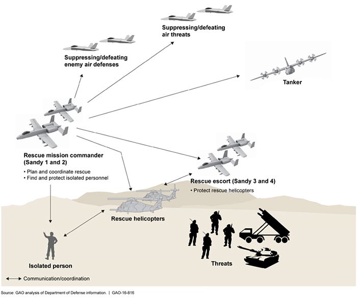 Pendant ce temps, une Task Force (Force opérationnelle) se tient toujours en alerte dans une base aérienne proche de la zone d’opérations, au Koweït et/ou en Jordanie dans ce cas de figure. Ils sont au courant de toutes les sorties aériennes de la journée, et font intrinsèquement partie de toute campagne aérienne (infographie ci-dessous). Elle est composée de forces spéciales de l’Armée de l’Air (Pararescuemen) ou de toute autre unité spéciale disponible, au moins deux hélicoptères d'assaut et de combat (HH-60W) et de l’appui aérien (A-10). Elle prend en compte lors de la préparation de la mission, des menaces ennemies notamment la défense sol-air (telle le S-400 ou TOR-M1), de la météo ainsi que des ravitaillements. Ainsi, une mission longue distance peut nécessiter des ravitaillements en vol (par HC-130) ou la préparation de zones de ravitaillement au sol. La défense aérienne et l'appui-feu peuvent être effectués par des avions de chasse, la sécurisation de la zone de récupération peut être réalisée par des hélicoptères de combat tandis que les hélicoptères d'assaut transportent les forces spéciales.