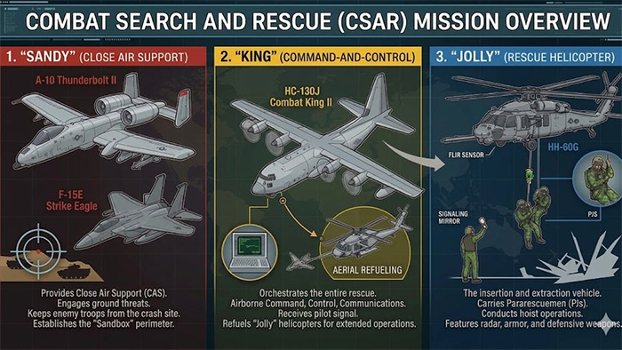 Les tentatives de récupération des équipages existaient depuis la 2e Guerre mondiale, mais elles prirent beaucoup plus d’importance lors de la guerre du Vietnam avec 4120 vies sauvées dont 2780 au combat. La plus extraordinaire et la plus importante opération CSAR de cette guerre est celle de «Bat 21» en 1973 en plein territoire nord-vietnamien. La récupération du Lieutenant-Colonel Hambleton a pris 11 jours. Il est guidé par sa radio de survie. Pour éviter que l’ennemi puisse intercepter les instructions, on guide Hambleton, joueur de golf invétéré, en faisant référence aux distances et directions générales de différents parcours de golf qu’il connait bien. Pendant la guerre du Golfe «Desert Storm» en 1991, 38 appareils alliés furent abattus. Beaucoup d’équipages s’éjectérent très profondément en territoire irakien, souvent à proximité immédiate d’installations militaires, rendant ainsi impossible leur récupération. Sept missions de récupération seulement furent lancées et trois débouchèrent sur la récupération de membres d’équipages derrière les lignes adverses. En Bosnie, en 1995, durant l’opération «Deny Flight», le Capitaine O’Grady (pilote d’un F-16 américain) est sauvé après six jours(1).